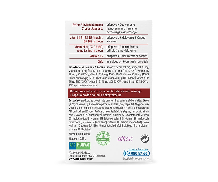 | Affron® izvleček žafrana Crocus Satvius L. | 28 mg |